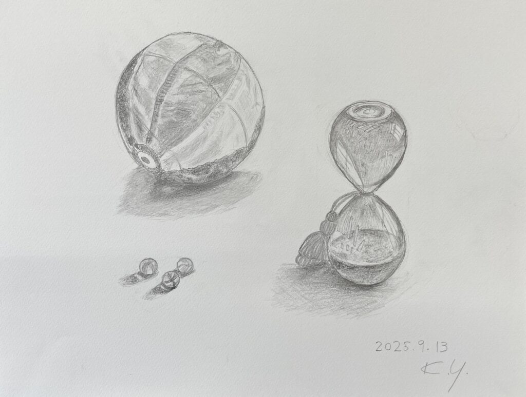 それぞれのモチーフの特徴を丁寧に観察しながら描いていただきました。 紙風船のしわ、ビー玉の影の中に映る光、砂時計に映る窓の形など、しっかりと観察することで見えてくる要素が表現されています。