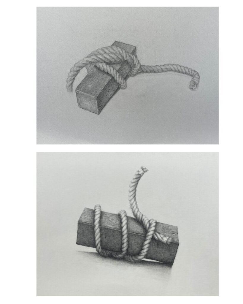 煉瓦の質感や重さ、そしてロープの硬く巻き付く様子まで丁寧に描かれています。