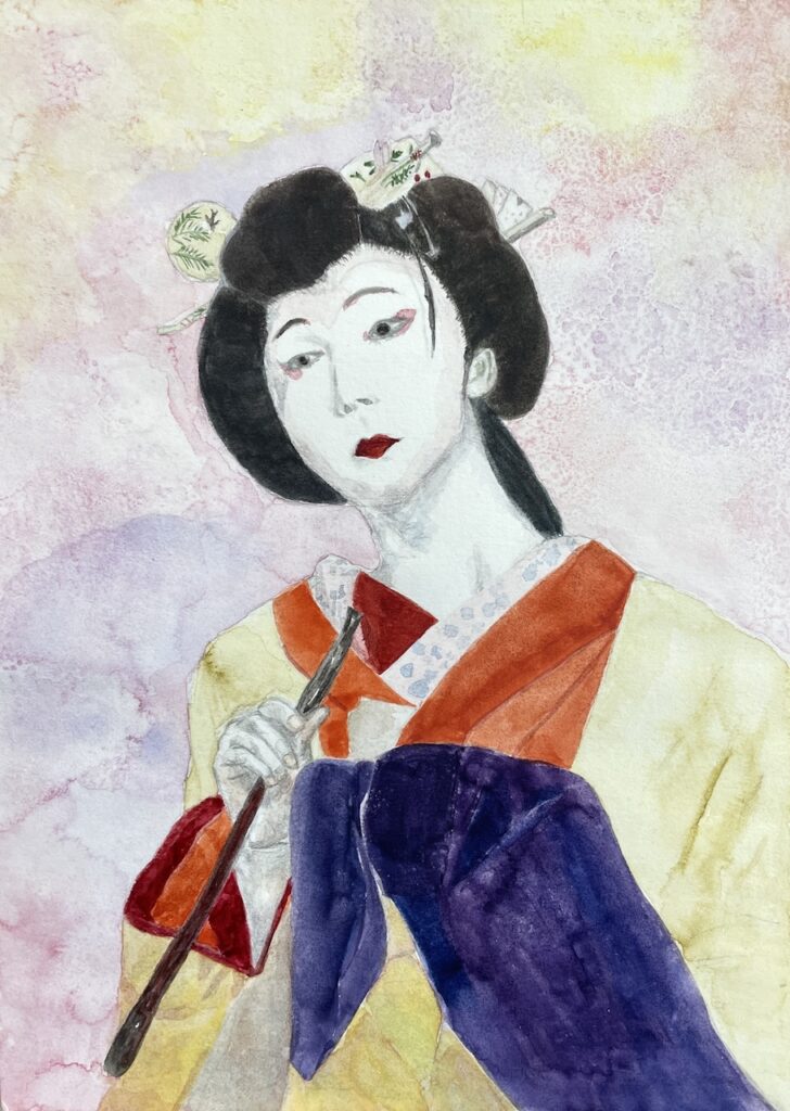 人物に目が行くと思いますが、今回は背景制作について少しご紹介します。 この背景に見られる独特の模様は、実は「塩」を使った技法によるものです。 絵の具がまだ乾かないうちに塩を撒くと、塩が水分を吸収し、独特の模様や効果が生まれます。 今回の作品では、和風の色合いとよく調和していて、とても上品な印象になっていますよね。