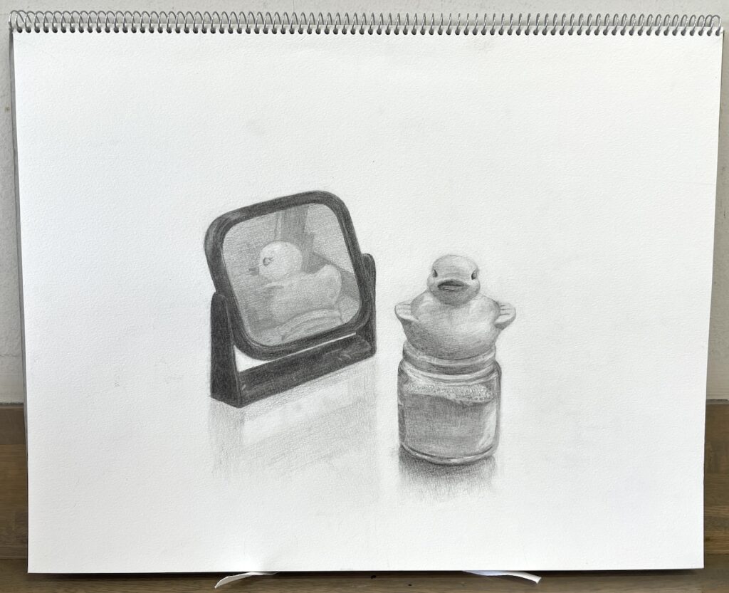 こんにちは、いずみ絵画教室です。生徒さんのデッサン作品をご紹介いたします。 実際に目で見ているアヒルや瓶の部分と、鏡の中の虚像、それぞれよく観察し特徴を描き分けられています。 鏡に映った部分の描写は、実物との明度差に着目してみると描きやすいことがあります。鏡に映ったものは少しだけ暗く見えたり、印象が弱く感じます。鏡は映り込んだ光が100%反射しているわけではないからです。 心理的な印象や思い込みにとらわれずに、物理的な現象に着目してみると、デッサンに説得力が生まれます。 論理的に観察する視点は大切にしたいですね。
