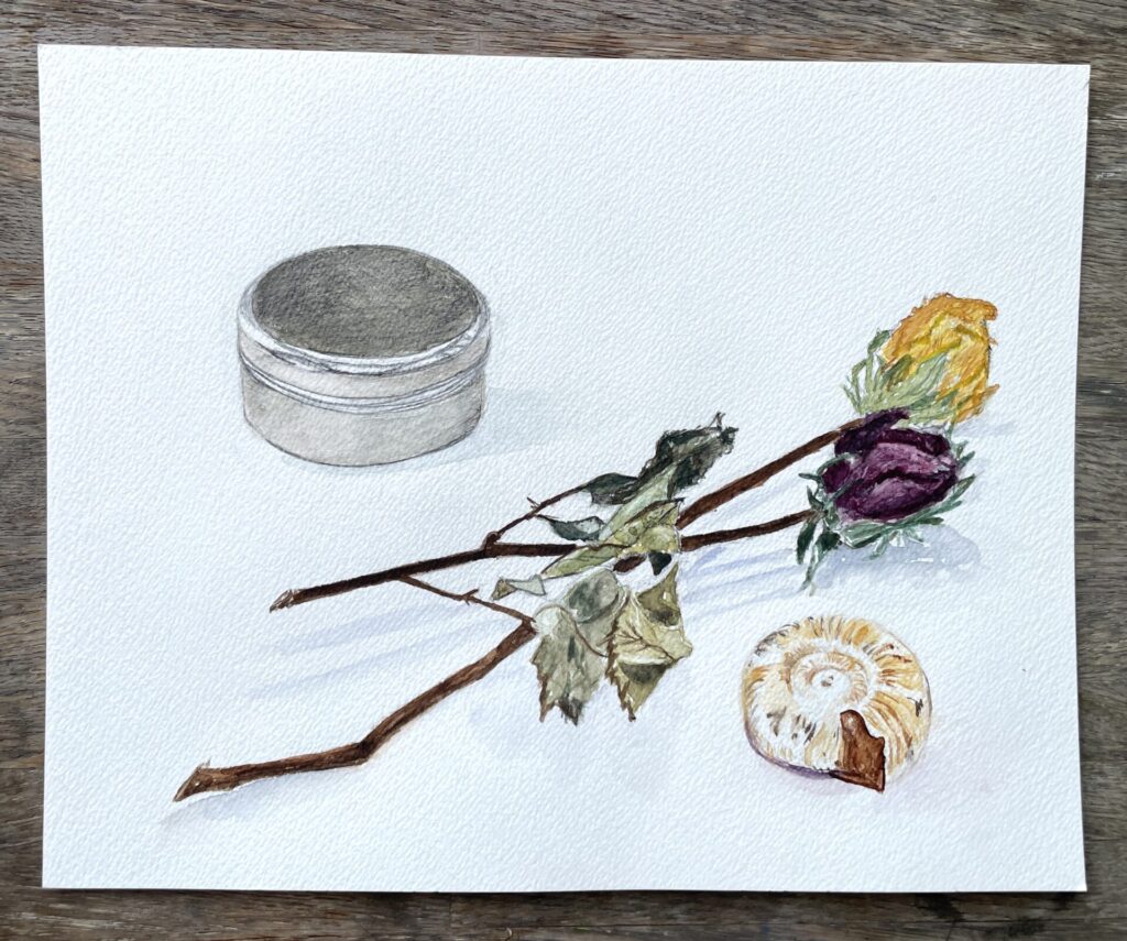 ドライフラワーの薔薇とアンモナイトの化石、どちらも落ち着いた渋い色味のモチーフです。