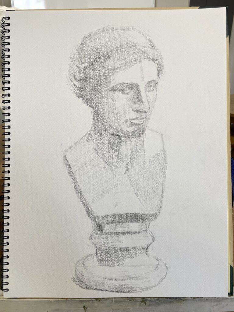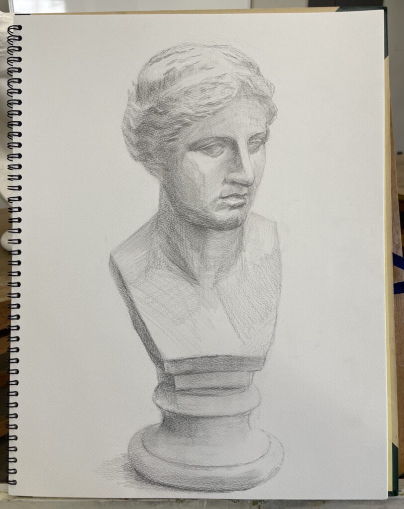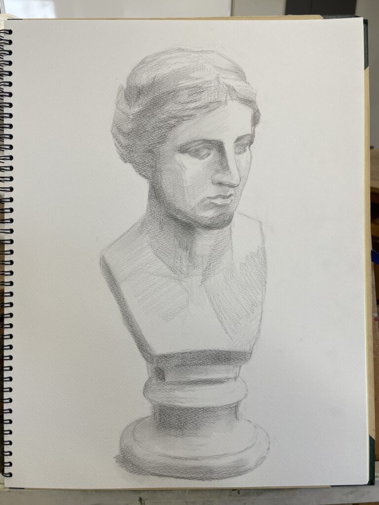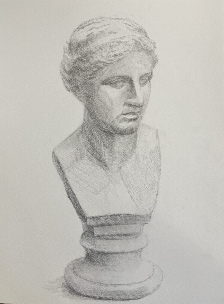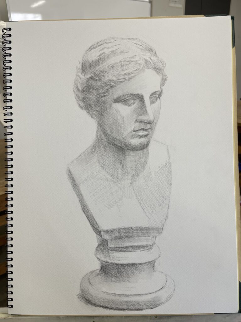 【デモンストレーション】ミロのヴィーナスの首像です。3時間のデッサン工程となります。もっと長い時間をかけ、細部を詰めていくような描き方でも大きな進め方の流れは変わりません。 流れを記載すると以下の通りです。 ①アタリをつけて、全体の形をつかむ。②形を見直しつつ、大きな陰影を入れる。③ティッシュで必要な部分を擦り、調子の幅を広げる。④陰影を強めたり、細部を整え、石膏の印象に近づける。 初めて描く方は、①と②(特に①)を大事にしていきましょう。 みなさん楽しみながら描いていきましょう。武田もトレーニングを重ねます!